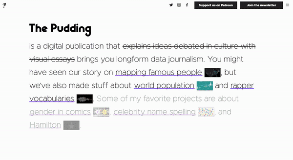This time I present you The Pudding! The Pudding is an exciting digital publication that produces stunning visual essays on a wide variety of topics, ranging from pop culture and science to sports and politics. Their articles are designed to be informative, visually engaging, and interactive, making them perfect for readers who are looking for something more than just text-based content.
