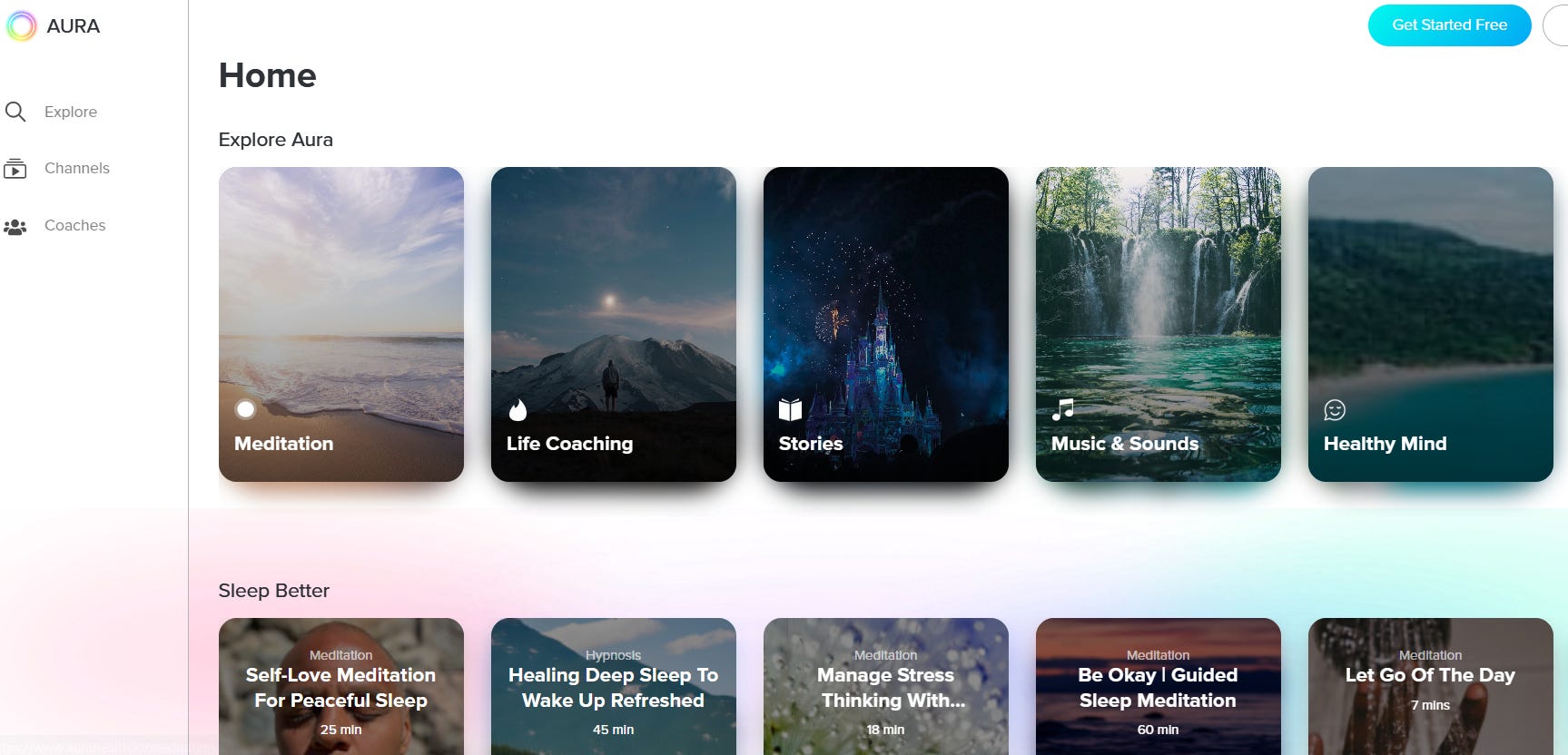 Aura Health is an app and platform that offers guided meditation and mindfulness exercises to help people reduce stress, improve sleep, increase focus, and achieve emotional balance. The app provides a wide range of personalized guided meditations on various topics such as stress reduction, anxiety management, sleep aid, and self-care.